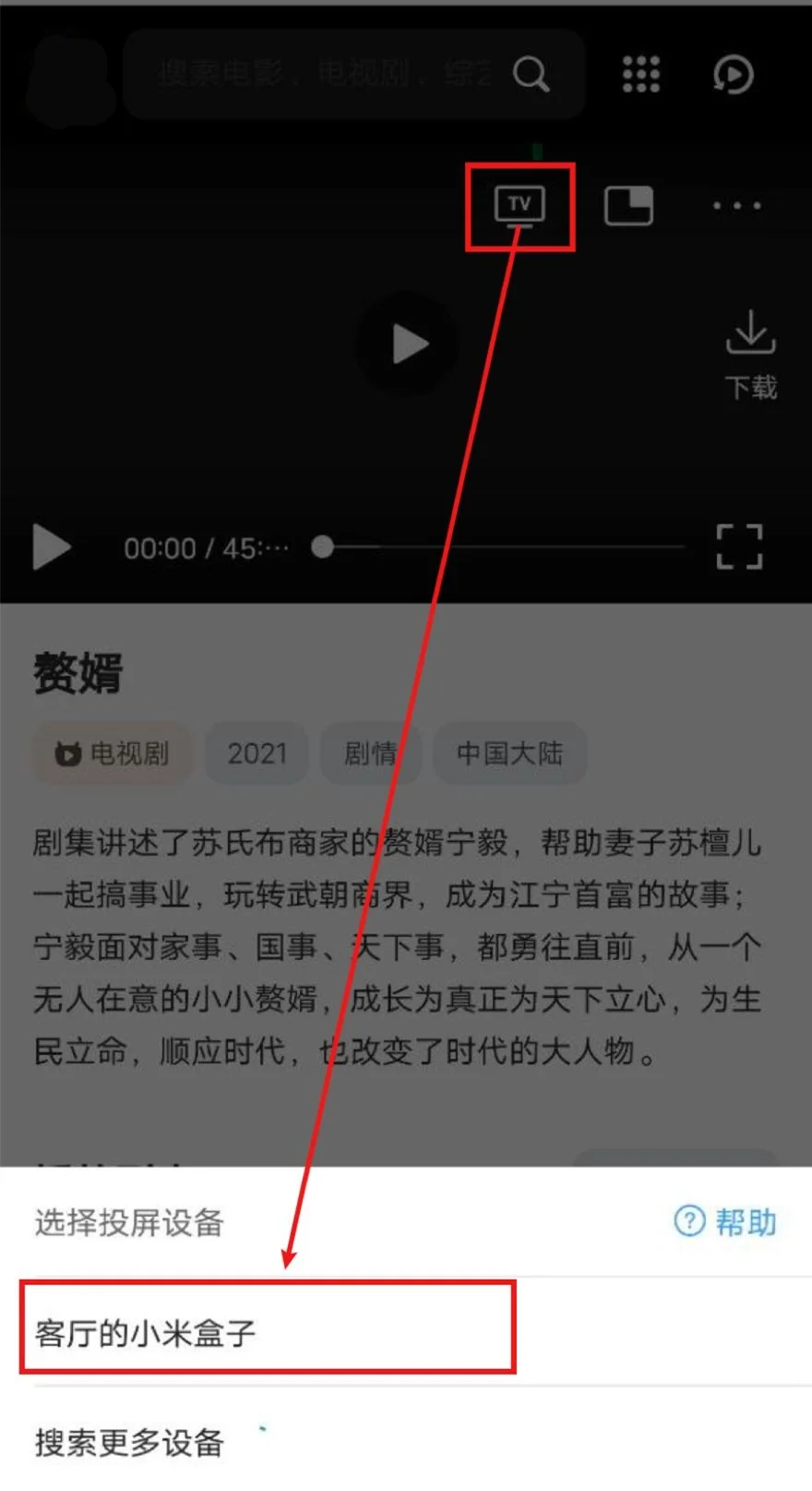 安卓夸克浏览器->打开網頁版->开始播放->全屏->左下角投屏->等待搜寻到智能电视/电视盒子->选中,即可投屏。